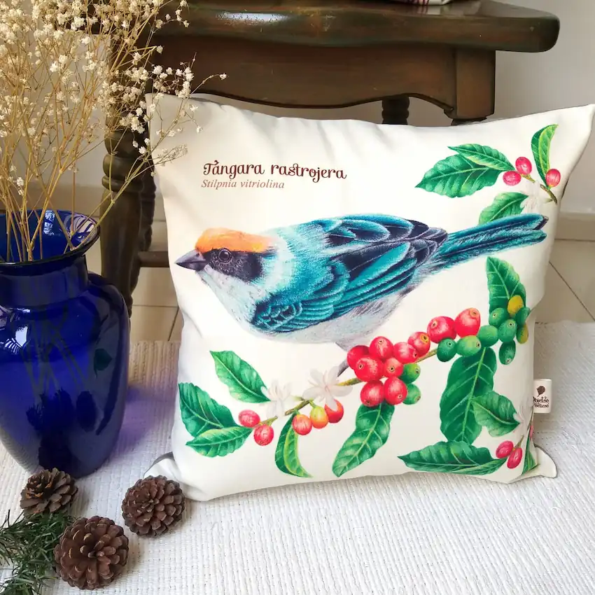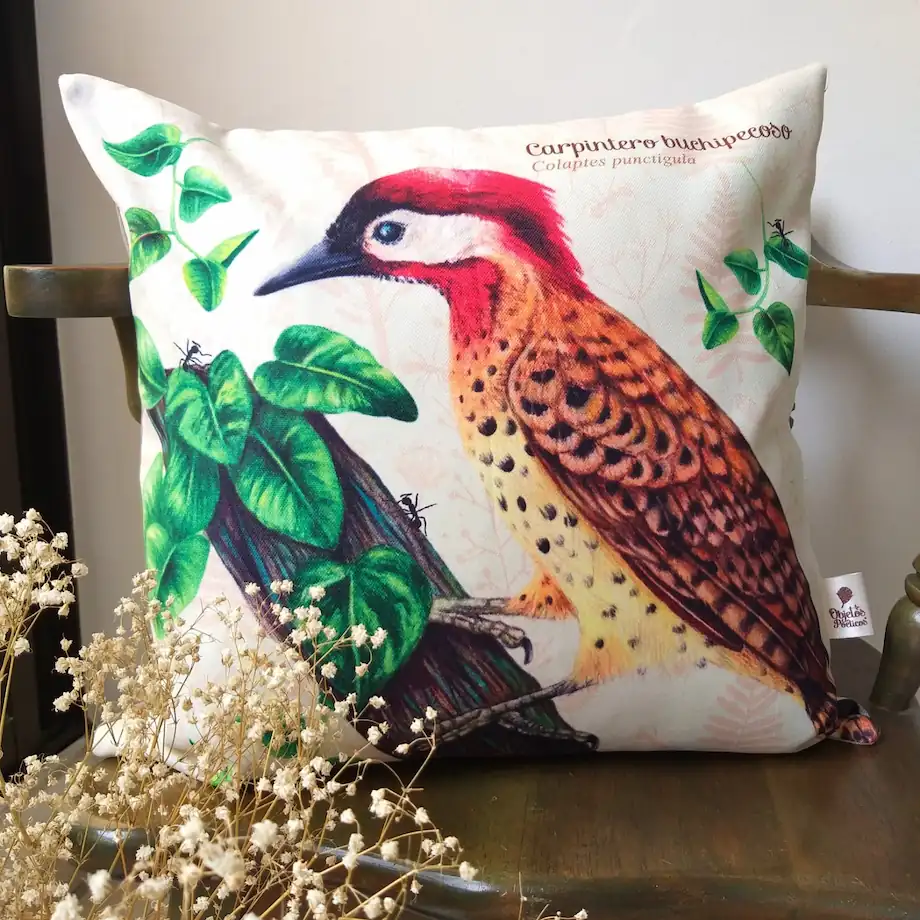 Esta funda de cojín ilustrado es una fusión entre arte, sostenibilidad y bienestar. Está fabricado con textiles reciclados provenientes de botellas PET, ayudando a reducir residuos plásticos mientras embellece tus espacios. Sus ilustraciones, hechas a mano con lápices de color, reflejan la fauna y flora colombiana, aportando calidez, inspiración y un toque natural a tu sala, cama o rincón favorito. Ideal para quienes buscan decorar con sentido, suavidad y estilo, cuidando el planeta desde los detalles cotidianos.